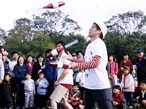さて、パレードが終わり、KJCのパフォーマンスをしよう!の時間です。会場を見渡しているとなにやらあやしい半裸体の人が。金粉ショーをやるそうです。興味津々ながら、自分たちの場所を確保せねば、と会場を歩き回りました。会場は雑多な雰囲気。とてもアジアンな香りがします。面白そうなものがたくさんあり、見てまわりたいのですが、まずはパフォーマンス。場所を見つけて、いざスタートです。今回はハードパンチャーとコーンさんの二人ショー。幸先よく、人を捕まえてはじめます。まずはハードパンチャーのディアボロ。が、ここが誤算の始まり。風を考慮してディアボロを軽くポーンと投げ上げたのですが、あららららら。それでも風に乗って遥か後方に流されていきます。そのあとも投げ物は風に流されてとても苦労しました。自分の思った通りにものが動かない。「大道芸人殺すにゃ雨風あれば」という言葉もありますが、まったくそのとおり!それでも、なんだかんだ言って、2重3重の人垣に囲まれながら楽しくショーを終わることができたのでした。このあと、こどもステージで一度ショーをして、パフォーマンスは終了。風の日は本当に大変です。強風の日も安心してできるプログラムを考えるのは、今後の課題でしょう。パフォーマンス終了後は、各々まつりを楽しみました。こどもたちにジャグリング教室を開き、一緒になってボールを追いかけて遊んだりもしました。こどもたちの上達のはやさにはびっくり。こういうところから未来のジャグラーが育っていったらうれしいですね。