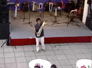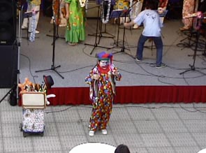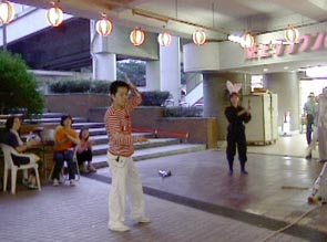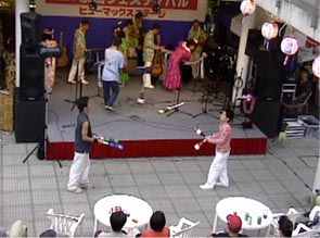 まずは20日。強い日差し、夏です。本日のステージは1回のみ。ステージの時間まで路上でパフォーマンスしてウォーミングアップ、準備はOKです。本番のステージでは30分という持ち時間を目一杯使って、楽しくショーができました。これも観てくれた皆さんのおかげです。1回のステージじゃものたりん、と夜の部、駅前にてゲリラ・パフォーマンス。帰宅途中の方々をつかまえて大いに盛り上がりました。文字通りへとへとになるまでがんばりましたよ。