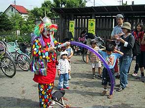 堤さんはピエロのかっこうをしていてとても目立つので、「あっ、ピエロだ。」「ピエロさん、風船作って。」などとみんなに追いかけまわされ、駐輪場には風船を作ってもらいたい人たちの長い行列ができました。堤さんはもうお茶を飲むひまもなく、汗びっしょりです。ぼくは堤さんの手伝いをして、風船をふくらましたり、作れるものを作ったりしました。でも犬ぐらいしかうまく作れないので、残念でした。もっと風船もうまくなりたいです。結局、おまつりが終わるまでの2時間ほど風船を作り続け、風船を2袋も使ってしまいました。