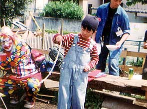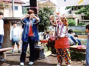 国分寺駅からの道はまるで迷路のようで、着くともう10時50分でした。堤さんはもうすっかりピエロさんになって、女の子たちに囲まれています。ああどうしよう、またドキドキしてきました。簡単に打ち合わせをして、堤さん、僕、堤さんの順番で出ることになりました。11時になり、「これからピエロさんが登場します。」と放送が入りました。まず、堤さんが皿回しをします。ぼくもだんだんやる気が出てきました。いよいよ出番です。ロープマジックを3つしました。緊張していたせいかいきなり失敗してしまいましたが、「がんばれ!」と声をかけてくれる人もいて、2回めにはうまくいき、みんなから拍手をもらいました。その後は再び堤さん。あらいぐまのロッキーくんを使ったマジックには、こどももおとなも大喜びです。さすがだなあ。