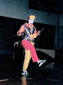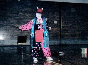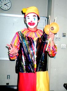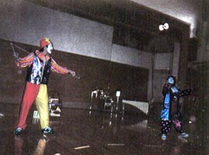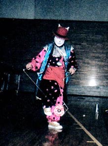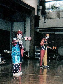 夏休みを目前に控えた7月19日、西東京市にある田無養護学校の夏祭りに参加して来ました。今回はめったにない火気を使用したパフォーマンスがOKな依頼をあって、つつみさんとしんごうきは意気込んで会場入りしました。しかし、今にも雨粒の振りそうな天気に、やむなく体育館でのパフォーマンスすることとなりました。いざ体育館出陣するとそこには、ベンチに座ってパフォーマンスを待つお客さんで一杯。そこにピエロ二人が入っていくと、「どんなことをするのだろうか」と自然と視線が集まる。
