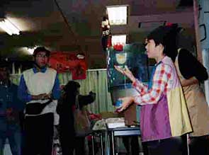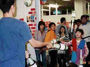 出番は3回あったのですが、永島さんのデビルスティック→ぼくのボ−ルとクラブ→永島さんのボール→ふたりでボールのスティール→ボールパス→クラブパスという順番にしました。ステ−ジみたいなところは「広場」として確保してあったけれど、最初はみんな集まってくれなかったりして大変でした。