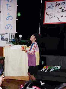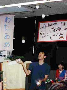 永島さんがデビルスティックの技を傘を使ってやったら、みんなに受けて人が集まってきました。ぼくは2、3回落としたけど、なんとかみんなから拍手をもらえました。永島さんはボ−ルを7つまでやって盛り上がっていました。さすが!ふたりでの技は上手にできたと思います。練習の時には10回やってやっと1回できていたクラブパスが1発で決まったのでビックリしました。よかった〜。