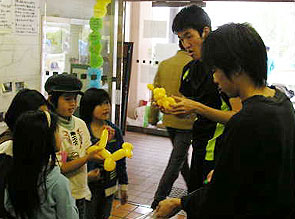 午後は玄関のような場所でバルーンを作って配りました。犬や剣、プードル、花などを作りました。どこへ行ってもバルーンのわんちゃんは人気者です。