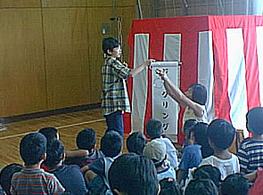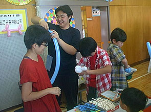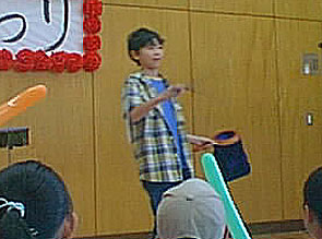 ビカビカの日がさす中、バスと電車に乗り継いで、花小金井駅で茅君と待ち合わせです。今日のプログラムや手順などを話しながら、徒歩5分(くらい?)、僕が工務店と児童館を間違える。(こんなこと書かなくても・・・) それから徒歩2分、花小金井南児童館に無事到着した。小平ジャグリング倶楽部の控え室に入り、僕は今日持ってきたマジック道具を漁った。漁ると同時に今日の演目のセットをした。10分位して茅君のお母さんが到着し、アートバルーンショップと演技をするステージのあるお祭り会場に移動した。