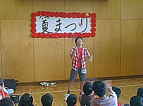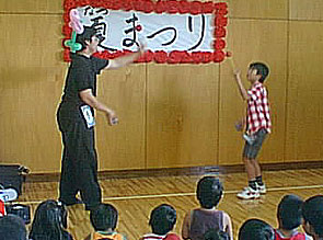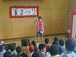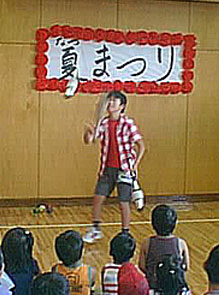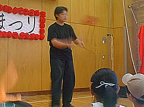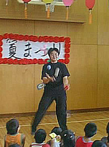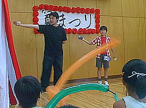 お客さんがステージ前に座った時、今回のお祭りの開会式が始まった。その後、おみこしや鈴木囃子などの演目があった後、いよいよ僕たち小平ジャグリング倶楽部の第一回目のステージだ。永井さんの横笛でのオープニングの後、茅君のマジック。茅君は三本の長さの違うロープが同じ長さになり、最後は一本になるというマジックをやった。そして僕のマジック。リングのマジックに続いてハンカチが一瞬で二枚になり、それをまとめると花が出てくると言うマジック。次に永井さんのボールの演技、茅君のボ−ルとクラブの演技、それから二人のボールパスで第一回目が終わった。