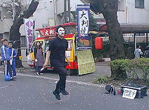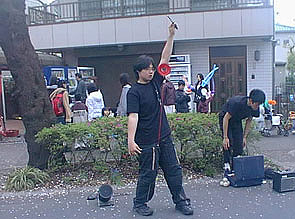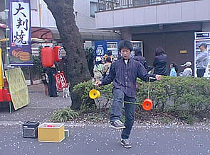 さくら通りの入り口(出口??)付近に小平ジャグリング倶楽部のスペースをいただき、そこに小さなグッズ売り場を設けて実演販売を行ないながら路上でパフォーマンスをしました。
