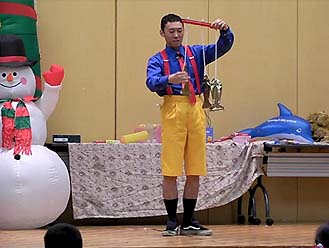 終わった後、スタッフに「今年はサーカス団の団長見たい、だったじゃん!」と言われました。途中、音響トラブルもありながら、何とか、子供達も盛り上がったようで良かったです。 その後、サンタクロースが舞台で子供達と写真撮影しながら、一人一人にプレゼントを渡してました。その間、他の子供達が暇なので、私と他2名(合部さん、武田君)がバルーンを作りました。