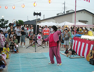 会場に着くと、公民館の広場にやぐらが組みあがり、会場には出店と来場者もチラホラ現れています。準備を済ませ、出番を待ちます。こどもたちの太鼓の後の2番目。ステージの場所で、私達が準備を始めるとこどもたちが集まってきます。