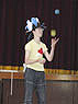 今回、敬老会と言うことで、日本のジャグリング=太神楽をイメージして、日本風の芸でまとめました。衣装も、着物、袴、紋付羽織をそろえました。音楽は、「和ロック」と言う分野の、和楽器でロック調の演奏モノを使いました。